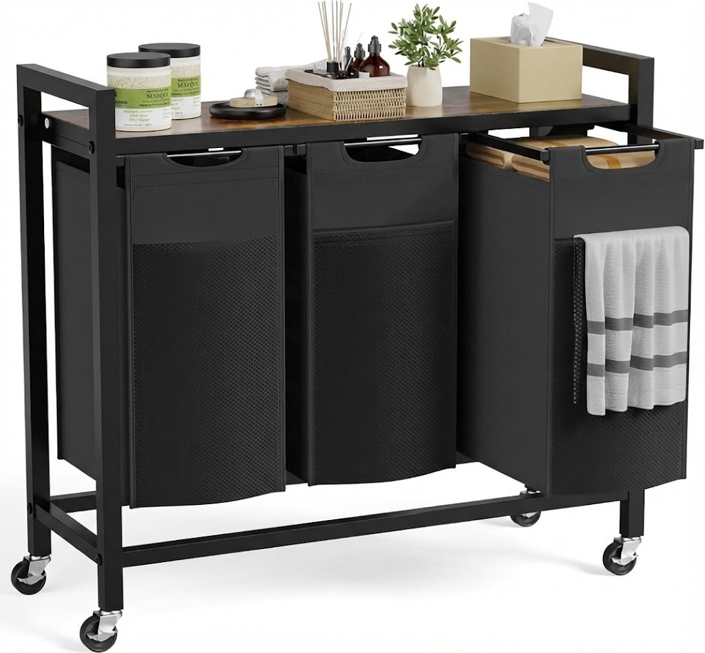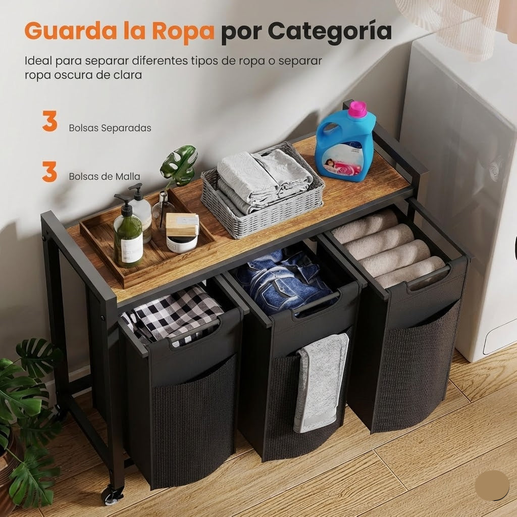 El organizador inteligente de 3 compartimentos con mesa incorporada que transforma el día de lavado. Separa la ropa sucia al instante y gana espacio extra.