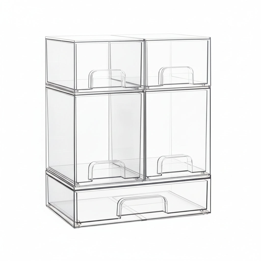 El sistema modular transparente que duplica tu espacio y mantiene todo a la vista. Olvídate de revolver cajones buscando tus cosas.